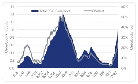 根據Gersemi Asset Management 的數(shù)據,當前汽車(chē)運輸船(chuán)訂單激增,今年迄今增長了30%,占目前在運營汽車(chē)運輸船(chuán)隊的25%——此外,這個(gè)蓬勃發展的行(xíng)業所展現的另一個(gè)顯著趨勢,是全球集裝箱承運人(rén)的重新進入。