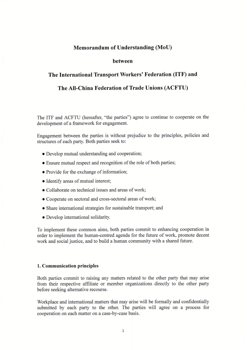 Article 1 In accordance with related national laws and regulations as well as relevant Conventions of International Labour Organization (ILO) and International Maritime Organization (IMO), this Agreement has been formulated with a view to promoting the development of the shipping sector, establishing a harmonious and stable labour relationship, safeguarding the legitimate rights and interests of Chinese seafarers and enhancing their decent work.