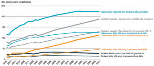 通(tōng)過采用節能技(jì)術(shù),我們還(hái)可(kě)以實現額外的減排量。具體(tǐ)而言,在滿 足EEDI要求的節能基礎上(shàng),各類船(chuán)舶通(tōng)過節能技(jì)術(shù)可(kě)實現的額外減排量分别為(wèi):集裝箱船(chuán)25%,散貨船(chuán)18%,油輪18%,液化天然氣船(chuán)為(wèi)26%,這些(xiē)都是各船(chuán)型的平均值。因此,為(wèi)了達到EEDI第三階段要求,我們不僅需要考慮降低(dī)裝機功率,還(hái)可(kě)以通(tōng)過提高(gāo)能效技(jì)術(shù)來(lái)實現節能減排。評估結果表明(míng),與目前的平均船(chuán)隊相比,節能可(kě)以使集裝箱船(chuán)的CO2減排量達到約30%,散貨船(chuán)達到約45%,油輪達到約50%,液化天然氣船(chuán)達到約60%。