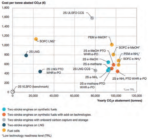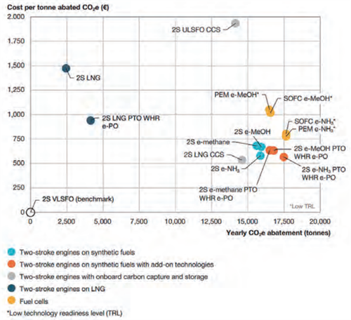 根據圖3,二沖程雙燃料發動機使用合成氨燃料的絕對減排潛力為(wèi)每年約92千噸CO2當量,減排成本為(wèi)每噸460歐元。若在二沖程氨燃料發動機中集成PTO軸帶發電(diàn)、廢熱回收和(hé)合成引燃油噴射技(jì)術(shù),每年可(kě)減少(shǎo)多(duō)達102千噸CO2當量,減排成本降低(dī)至每噸450歐元。然而,這種配置會(huì)使推進方案變得(de)更為(wèi)複雜。對于一些(xiē)發動機運營商而言,标準氨燃料發動機因其簡潔性比有(yǒu)多(duō)種附加技(jì)術(shù)的發動機更受歡迎。對于二沖程甲醇發動機,其絕對減排量為(wèi)每年約93千噸,成本為(wèi)每噸640歐元。電(diàn)制(zhì)甲烷的絕對減排量也約為(wèi)每年93千噸,成本為(wèi)每噸500歐元。若采用相同的節能技(jì)術(shù),甲醇和(hé)電(diàn)制(zhì)甲烷的絕對減排量分别增至98千噸和(hé)96千噸,成本則分别降至每噸590歐元和(hé)每噸510歐元。