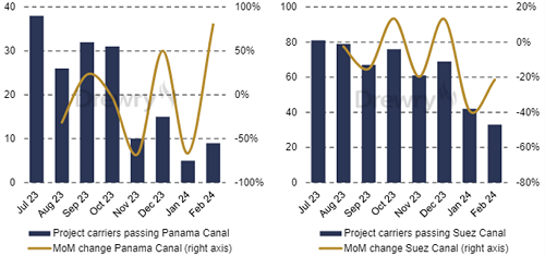 圖1 項目運輸船(chuán)通(tōng)過巴拿(ná)馬運河(hé)和(hé)蘇伊士運河(hé)數(shù)量(23年7月至24年2月)Source: Drewry Multipurpose Shipping Forecaster
