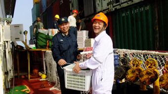 當地時(shí)間(jiān)2011年7月31日0500時(shí)分,新廈門(mén)輪安全順利到達指定海域。從0640時(shí)分開(kāi)始船(chuán)員和(hé)官兵們協力卸載搬運慰問品,在前後曆時(shí)5個(gè)小(xiǎo)時(shí)的搬運過程中,船(chuán)員和(hé)官兵們你(nǐ)幫我助,歡笑交談,結下了濃濃情意。