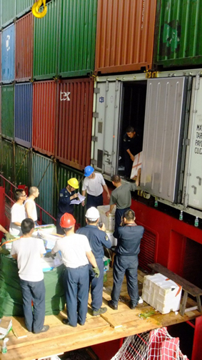 在多(duō)方的大(dà)力協作(zuò)下,2011年7月18日在蛇口港,新廈門(mén)輪裝妥滿載慰問品的兩隻20FT冷凍箱、兩隻20FT冷藏箱後及時(shí)啓航,開(kāi)始了肩負光榮任務,滿懷責任自豪的慰問之旅。該輪吳耀明(míng)船(chuán)長、張時(shí)根政委、姜燕輪機長針對運輸途中正好趕上(shàng)印度洋季風季節,風高(gāo)浪急的情況,為(wèi)确保船(chuán)舶和(hé)集裝箱的運輸安全,及時(shí)召開(kāi)船(chuán)員大(dà)會(huì),把任務和(hé)意義講明(míng)講請(qǐng),并多(duō)次技(jì)術(shù)骨幹船(chuán)員研討(tǎo)運輸計(jì)劃,制(zhì)定出運輸方案。他們在組織船(chuán)員加強對集裝箱綁紮情況進行(xíng)檢查确保航行(xíng)安全同時(shí),還(hái)組織甲闆和(hé)輪機兩個(gè)部門(mén),針對冷凍箱、冷藏箱運行(xíng)特點和(hé)要求,加強對冷箱的監管力度,增加對冷箱運行(xíng)狀況檢查的頻次。為(wèi)确保所運送的蔬菜瓜果的新鮮程度不受影(yǐng)響,該輪全體(tǐ)船(chuán)員做(zuò)出了積極努力。從啓航達到交接指定海域的13個(gè)日日夜夜裏,堅持每6個(gè)小(xiǎo)時(shí)化霜一次,并嚴格按照要求每天0800、1000、1600、2000四個(gè)時(shí)間(jiān)點檢查冷箱情況,确保冷箱控制(zhì)溫度始終處于所控要求之內(nèi)。