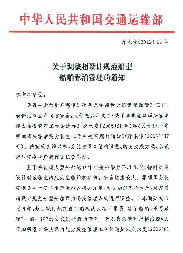 關于調整超設計(jì)規範船(chuán)型船(chuán)舶靠泊管理(lǐ)的通(tōng)知